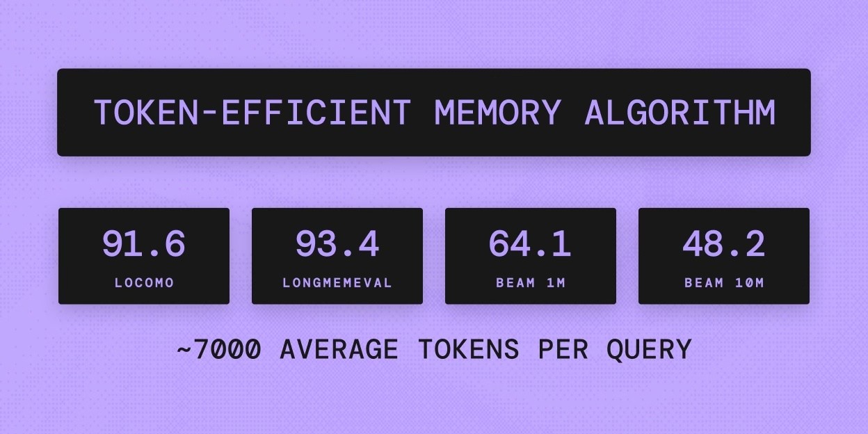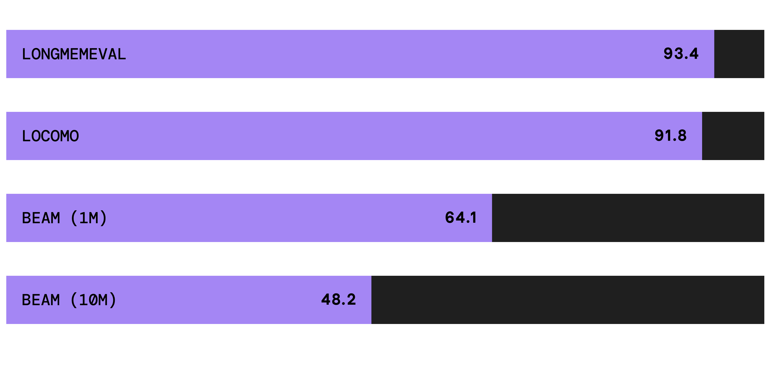 Benchmarked across LoCoMo, LongMemEval, and BEAM, achieves competitive accuracy while using under 7,000 tokens per retrieval call