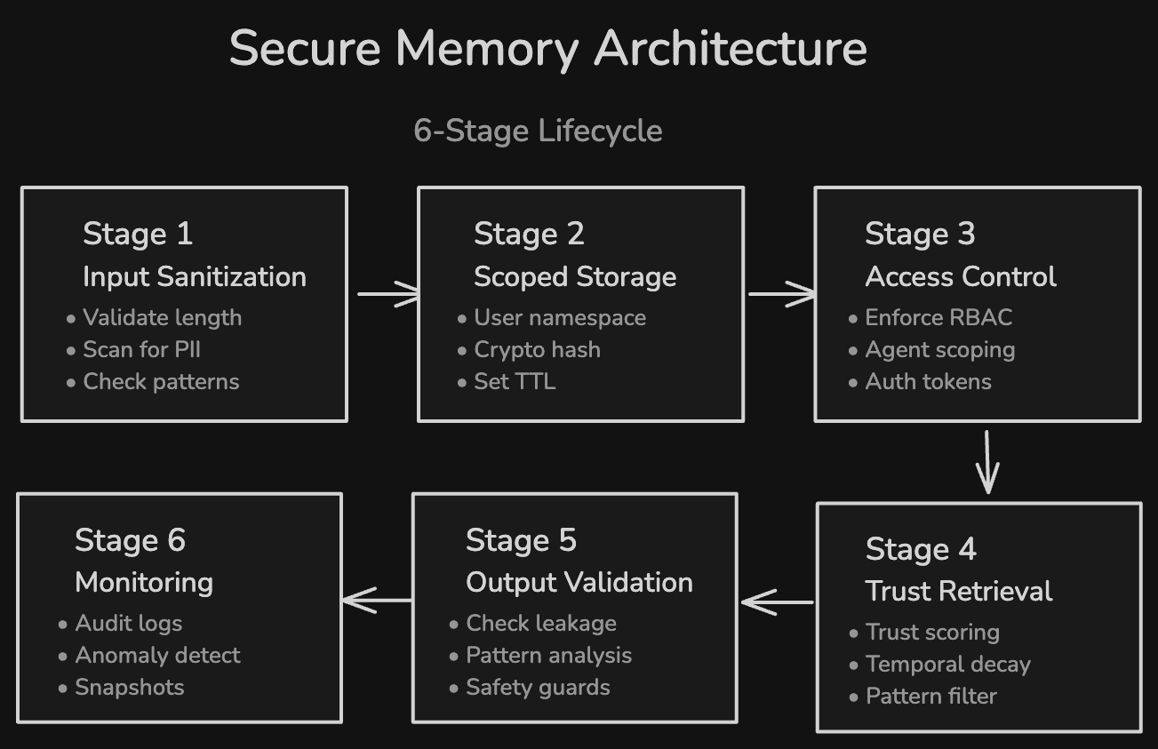 Stage 2: Scoped storage with isolation. Store memories in per-user namespaces with strict access boundaries. Apply cryptographic hashes to each entry for integrity verification. Set TTL values at write time.