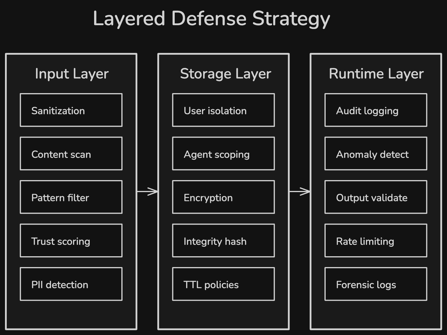 Stage 1: Input sanitization. Before any data enters memory, validate content length, scan for sensitive data patterns (PII, credentials, API keys), check for known injection patterns, and redact or reject flagged content.