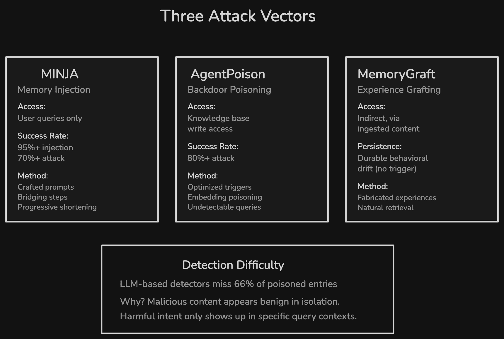 Three primary attack vectors exist: query-based memory injection, backdoor poisoning of knowledge bases, and experience grafting for persistent behavioral drift