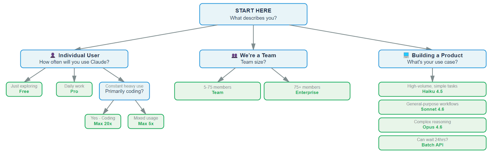 For most individuals, the decision comes down to usage volume. The Free plan works for casual use. Pro handles most professional workloads. If you're hitting Pro's limits daily, Max 5x ($100/month) is the next step - and at heavy usage, Max 20x ($200/month) is often cheaper than the equivalent API spend.