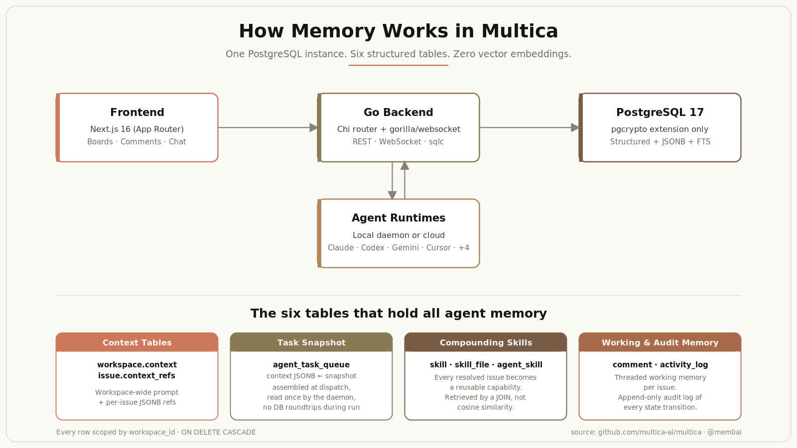 Multica's 15,400+ stars on pure relational + JSONB prove the "you need embeddings" narrative is not a MUST from infra + harness perspective. Though it’s needed downstream on agent context, i.e chat-assistant use cases.