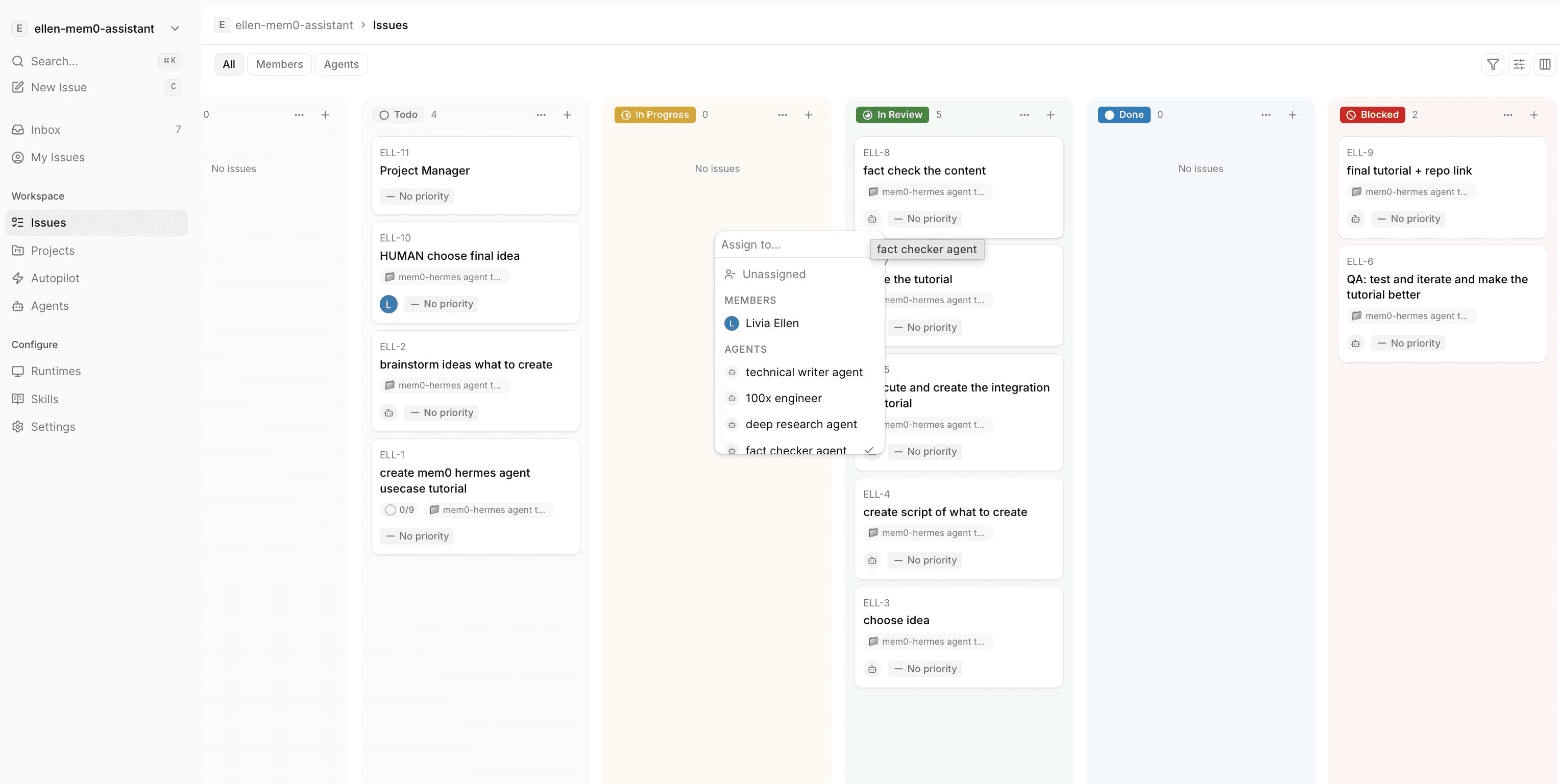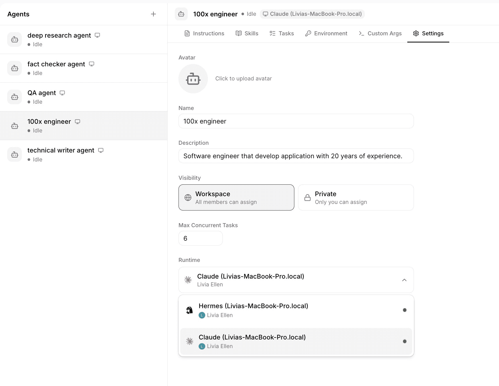 1. I can mix agents: Claude, Codex, Hermes, OpenClaw, Gemini, Pi, Cursor Agent. All on the same board, all pulling from the same skills library. Vendor-neutral.