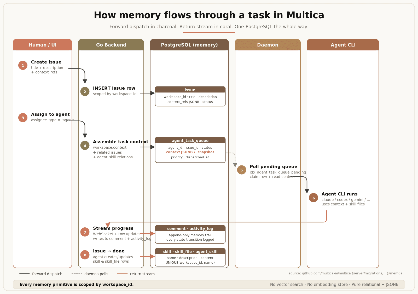 Multica got it right by starting with relational. I could still see this relational approach can be combined with AI agent memory system for a better agentic experience for its agent.