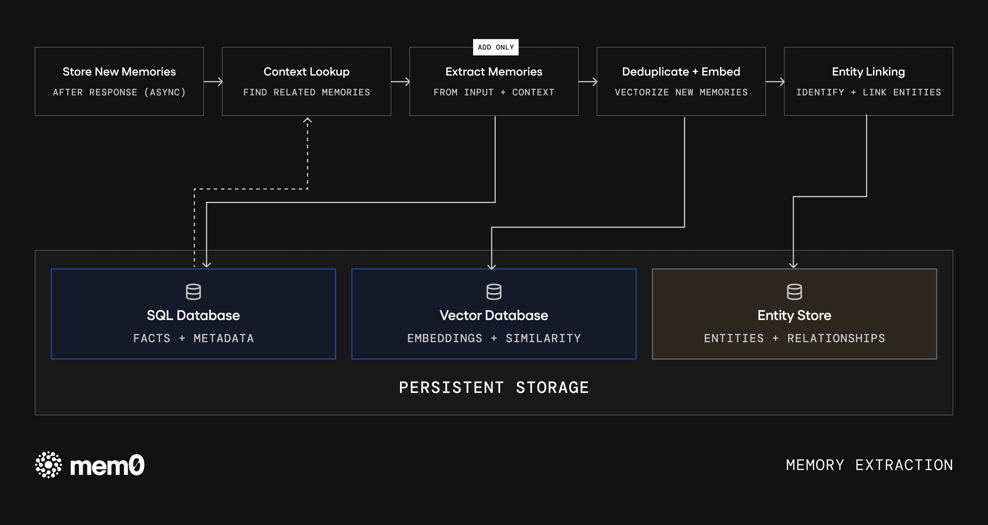 Fig 1: Memory extraction. Input flows through context lookup, single-pass extraction, deduplication, and entity linking before being written to persistent storage.