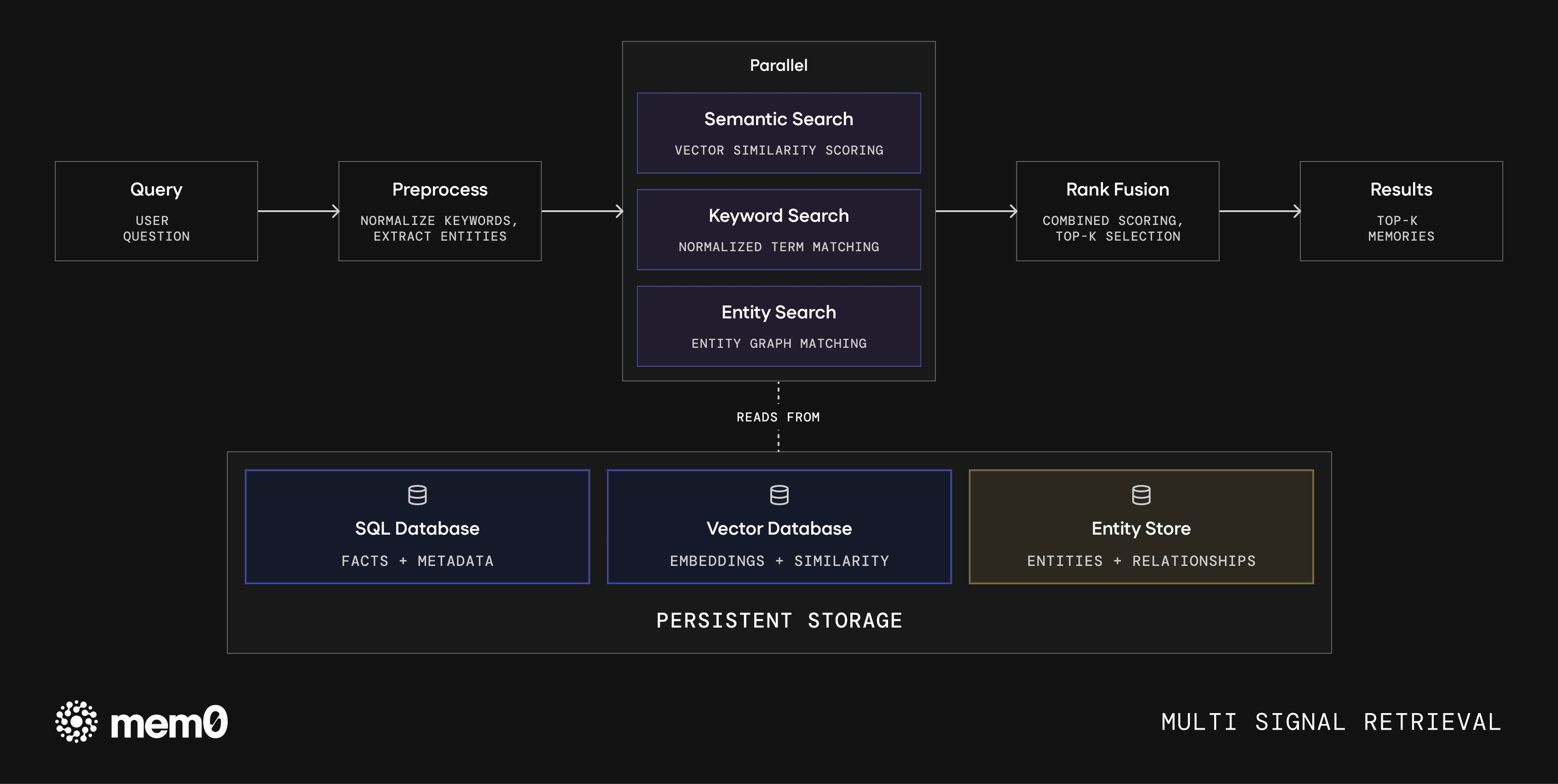 The retrieval stack runs three scoring passes in parallel, semantic similarity, keyword matching, and entity matching, and fuses the results. Different queries lean on different signals, and the combined score outperforms individual signal scores.