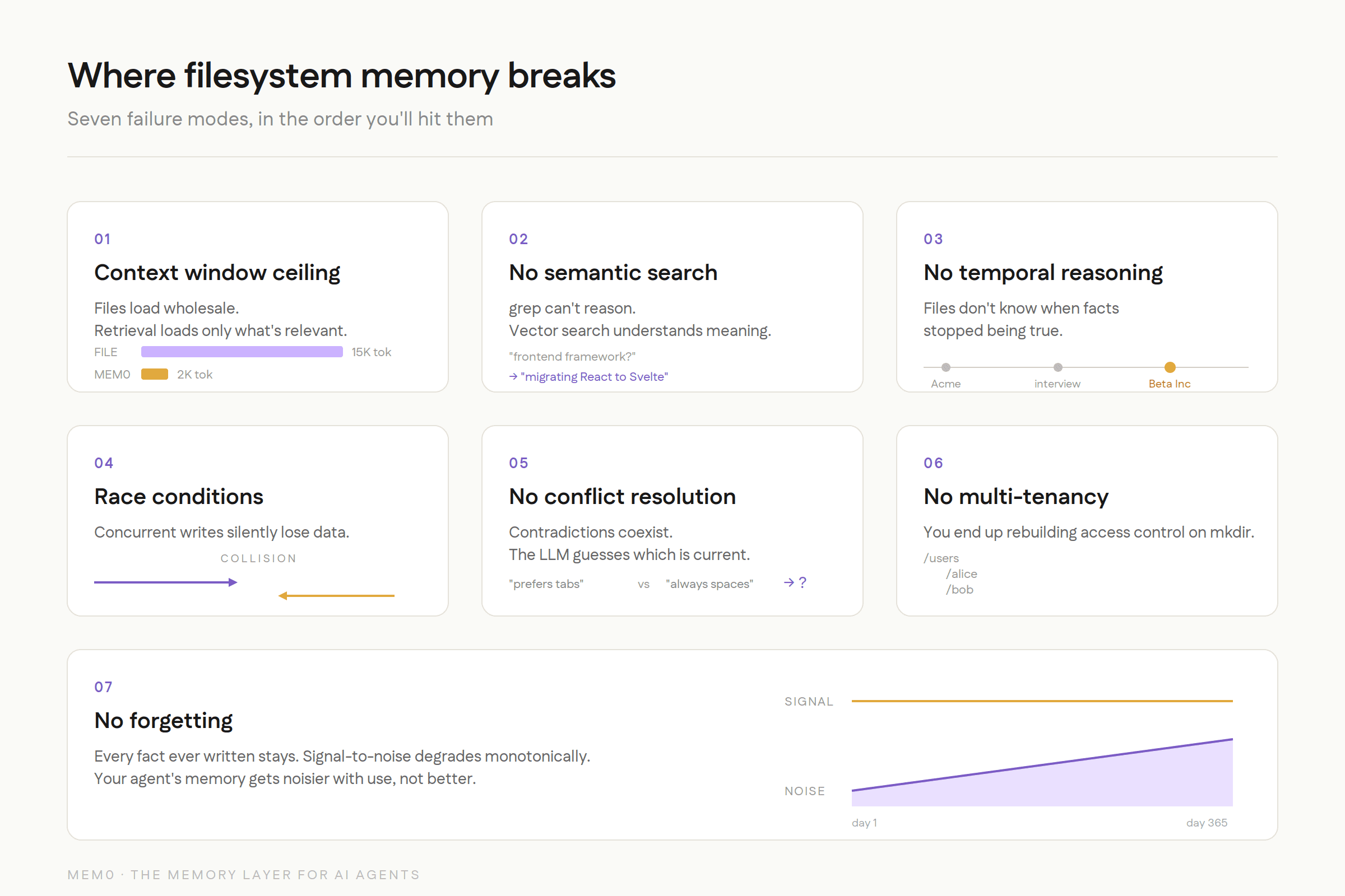 Files don't forget. Every fact ever written stays there permanently, taking up context window space, increasing noise, and making retrieval harder. The signal-to-noise ratio degrades monotonically over time. Your agent's memory doesn't get better with use; it gets noisier.