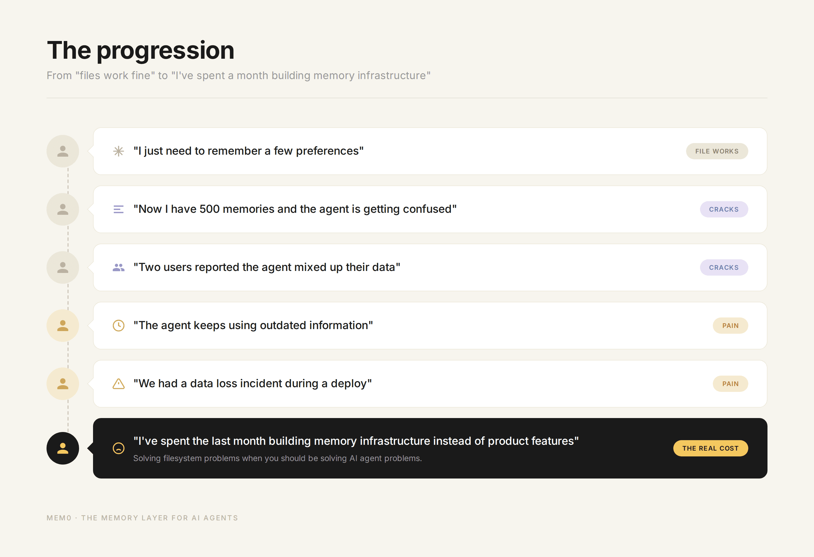 Step 6 is where the pain becomes undeniable. You realize you've been solving filesystem problems when you should have been solving AI agent problems. The memory layer should be something you plug in, not something you build and maintain.