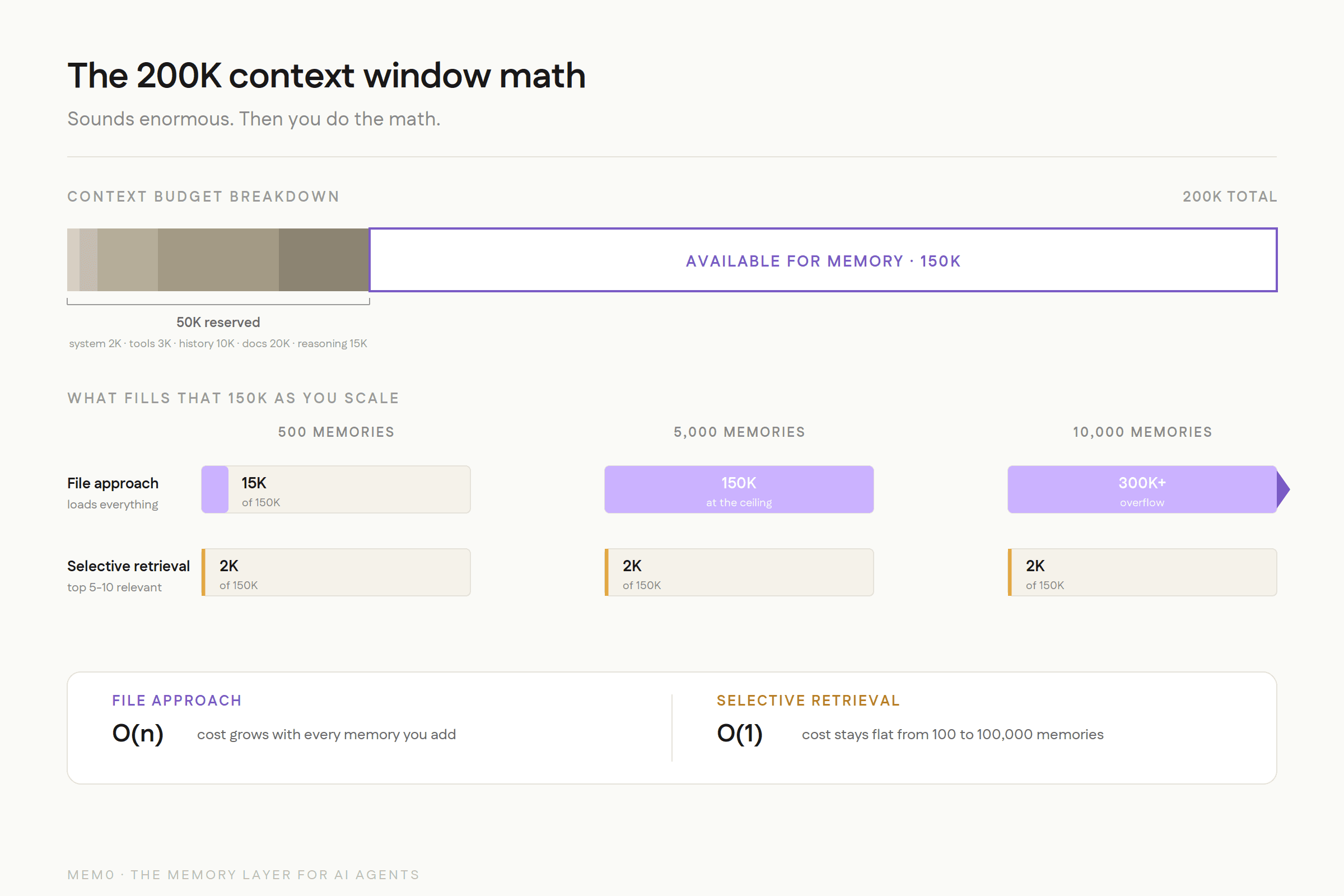 Sounds like plenty, right? But at 500 memories, you're already burning 15,000+ tokens just to load the memory file. At 2,000 memories, you've consumed a significant chunk of the context window before the user has even said hello. At 10,000 memories (which any production agent serving real users will accumulate within months), you've blown past the context window entirely.