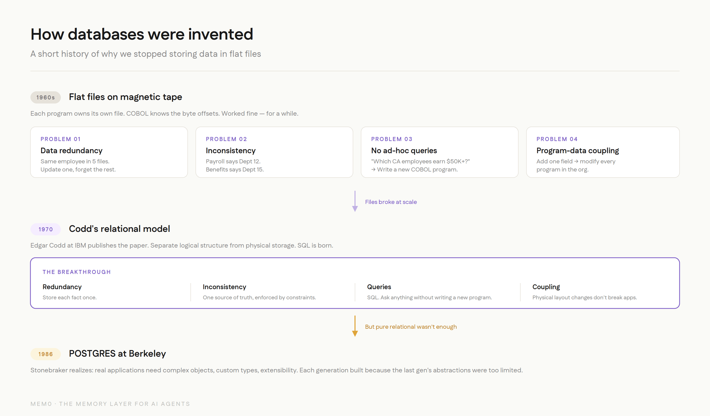 I've been building memory infrastructure at @mem0ai for two years. I've watched this pattern fail the same way, in the same order, in dozens of production systems, the same failure modes that killed flat files in the 1970s and forced the industry to invent databases: