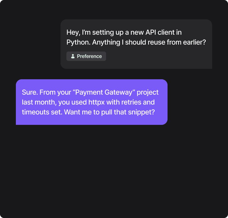 Let your tools remember your style, past questions, or preferred solutions.