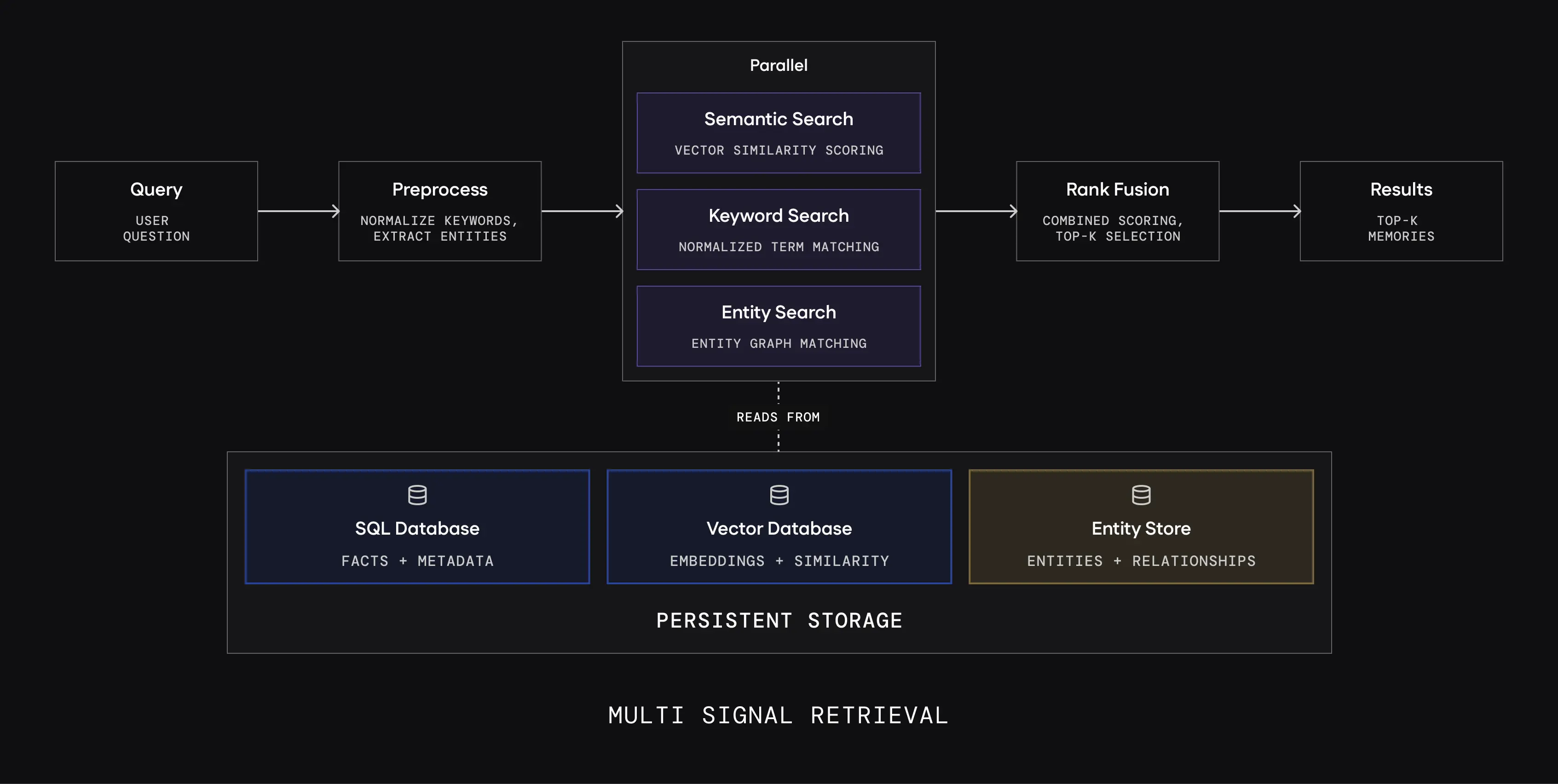 Retrieval stack now runs three scoring passes in parallel and fuses the results: Semantic similarity, Keyword matching, and Entity matching. The combined score outperforms individual signal scores.